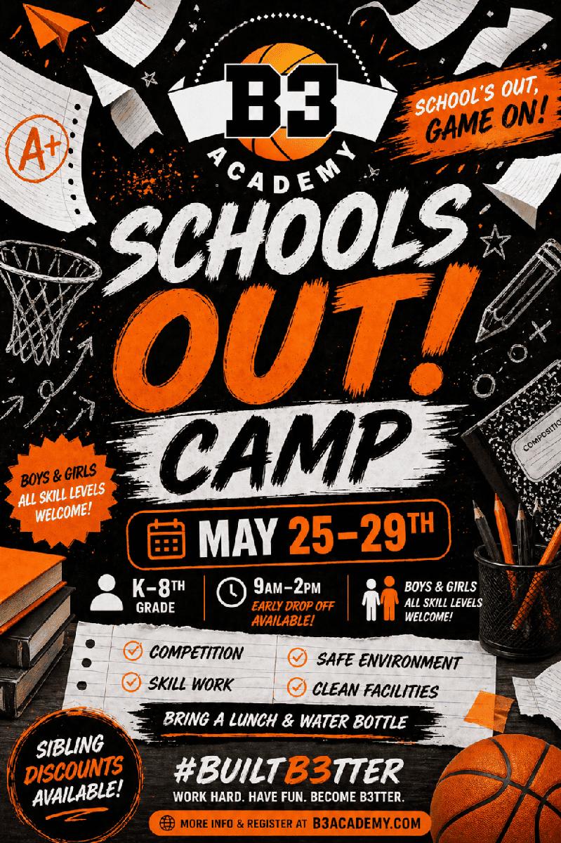 School is out and it is time to get in the gym. B3 Academy’s Schools Out Basketball Camp is the perfect way for boys and girls of all skill levels to stay active, improve their game, and have fun. Join us May 25 through May 29 from 9 AM to 2 PM, with early drop off available. Open to Kindergarten through 8th grade, this camp focuses on skill development, competition, and building confidence in a positive and structured environment. Players will work on fundamentals like ball handling, shooting, and defense while also competing in drills and games. Campers should bring a lunch and water bottle. Sibling discounts are available. Spots are limited. Register today.